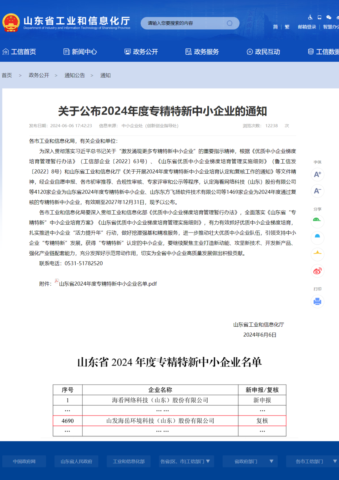 6月6日,山东省工业和信息化厅公布了山东省2024年度专精特新中小企业名单。我公司成功顺利获得复核,再次被认定为省级“专精特新”中小企业。这是对公司在环境技术综合服务细分领域多年探索创新成果的充分肯定。